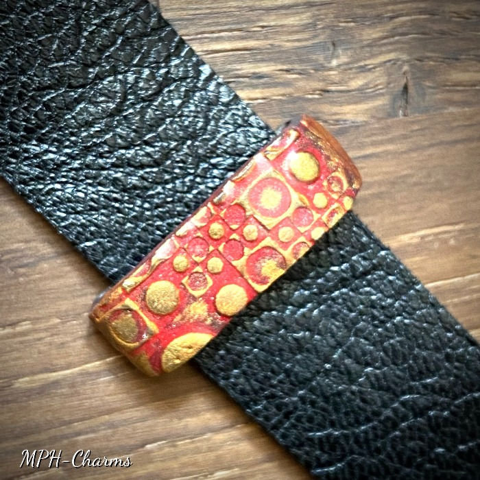 A wrap bracelet with acrylic bloom pour stone as a macramé cradled focal piece. Polymer clay fasteners and ca. 80cm soft recycled leather strap. The stone and fasteners are coated with UV-resin. Very flexible and free to choose your way to wear it. The end of the strap slides under the fasteners to hold the bracelet in place. One-of-a-kind design. Metal free.