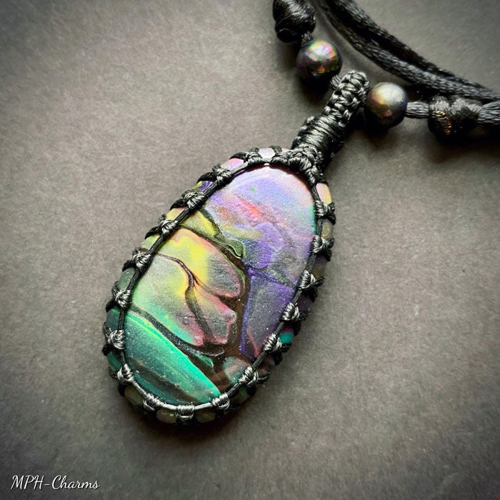 An acrylic pour stone pendant in macramé cradle. Coated with UV resin. 5mm iridescent acrylic beads. Strung on a smooth 2mm satin cord. Adjustable with minimum length of 45cm. 100% handmade one-of-a-kind piece. Metal free.