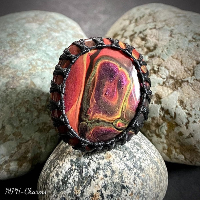 An acrylic pour stone macramé ring. The stone is coated with UV resin and wrapped in sturdy macrame cradle. 100% handmade and metal free one-of-kind piece. Lightweight, soft and amazingly comfortable.